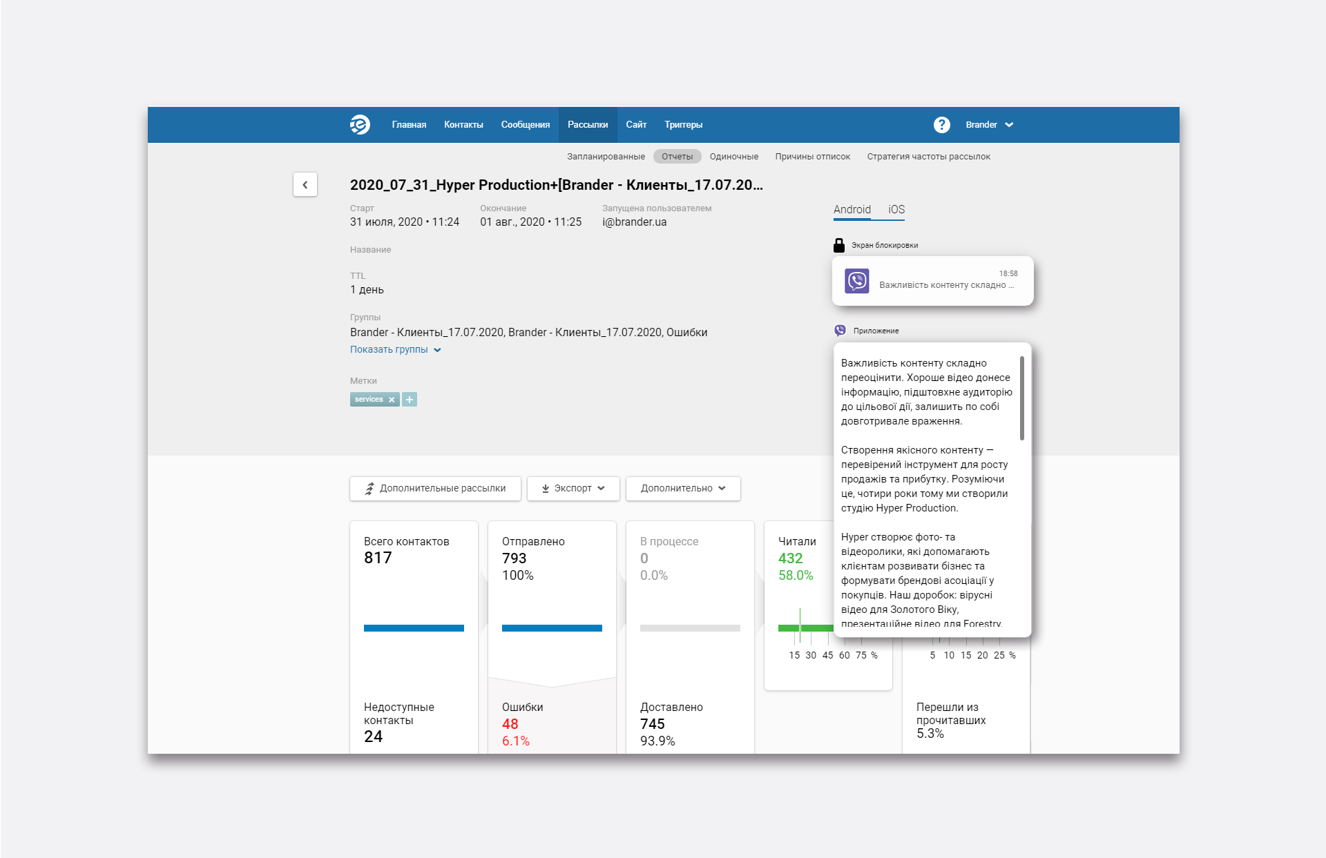 Зробити розсилку viber, значить отримати дуже детальну статистику про реакцію ваших клієнтів на неї. Сервіси розсилки збирають загальні дані про кількість тих, хто відкрив повідомлення й перейшов за посиланням. Якщо ви інтегрували маркетингову платформу зі своєю базою даних — то зможете дізнатися навіть більше, наприклад, хто саме з ваших клієнтів зробив цільову дію, і відстежити його подальший шлях сайтуом. Отриману інформацію можна використовувати для поліпшення маркетингової стратегії.