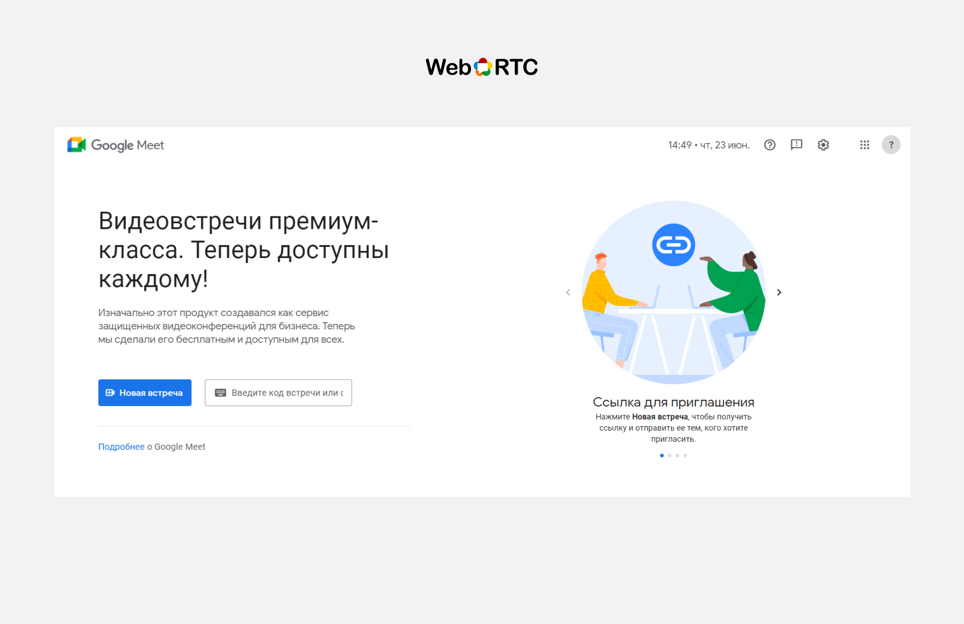WebRTC (Web Real Time Communications) — стандарт передачі потокових аудіо та відео, а також іншого контенту між браузерами. Його особливість — відсутність необхідності встановлювати ПЗ або плагін. Це технологія, завдяки якій, ви можете організовувати онлайн-зустрічі, з ким завгодно, незалежно від того, чи має він спеціальний додаток, а також який браузер і на якому пристрої він використовує.