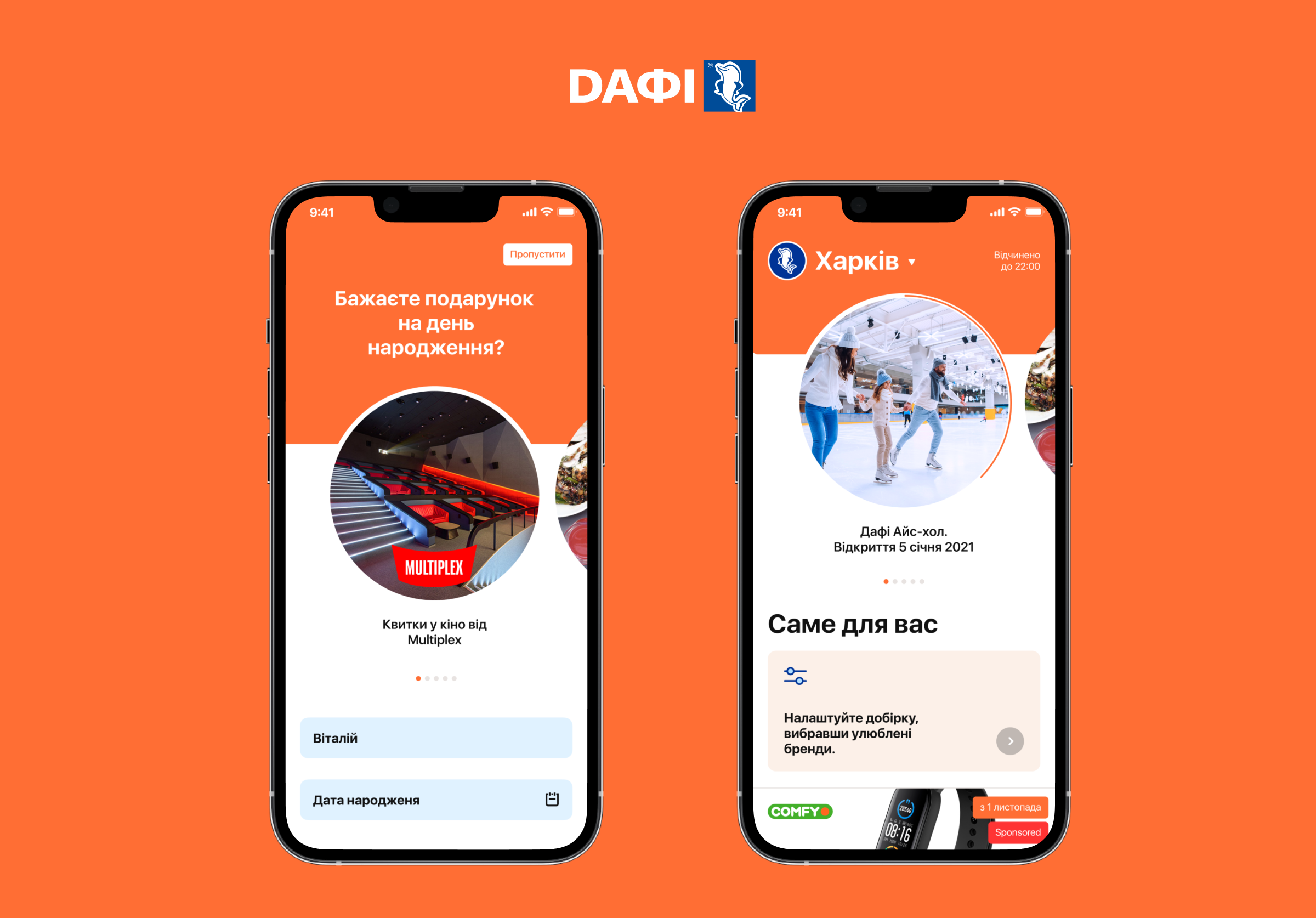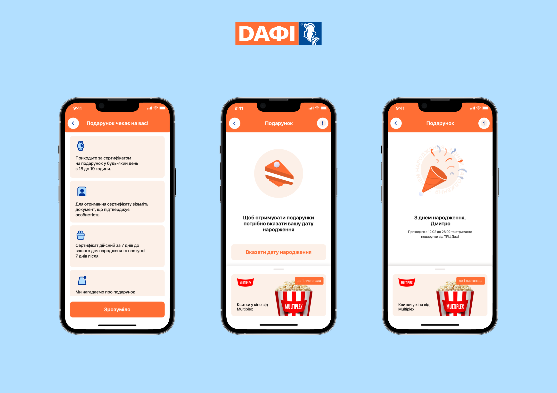 Для розуміння нюансів цієї частини роботи ми провели низку досліджень з метою вивчити середньостатистичного клієнта DAFI. Ми визначили, який інтерфейс має вирішити поставлене завдання. Для інтерфейсу прописали окрему логічну структуру, щоб клієнт не заблукав у додатку та купив усе необхідне. В результаті клієнти отримали можливість знаходити гарячі пропозиції, знижки та адреси найближчих точок DAFI. Ключові магазини цієї мережі знаходяться у Харкові та Дніпрі.
