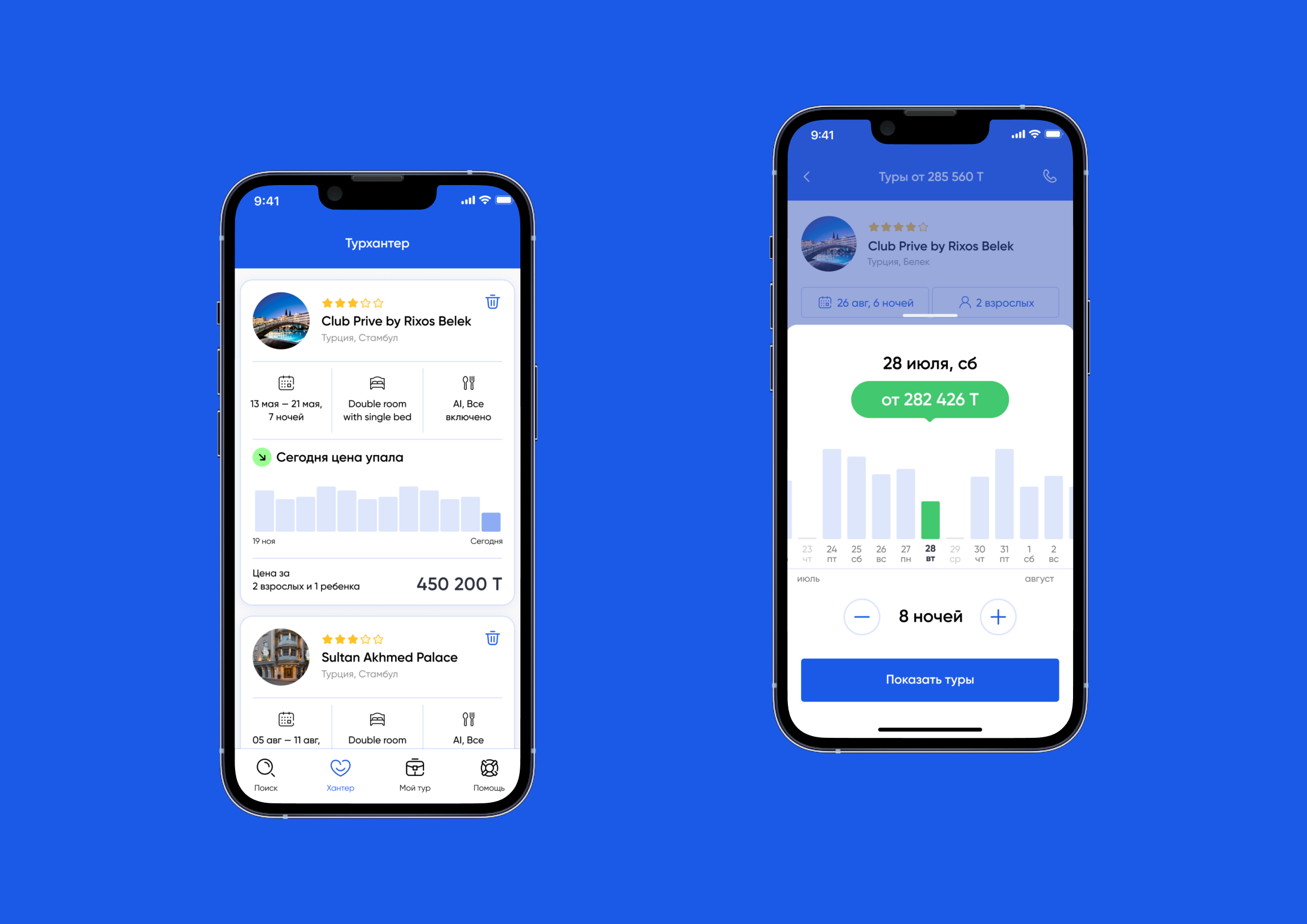 Враховуючи, що програма є агрегатором туристичних операторів Казахстану, нам потрібно було розробити алгоритм, який швидко збирає, обробляє та подає потрібні туристам дані у зрозумілому форматі. І в нас вийшло навіть краще, ніж було задумано спочатку. Наш додаток обробляє масиви даних у реальному часі, відображаючи ціни, доступні тури та вільні дати. Заплутатись дуже складно.