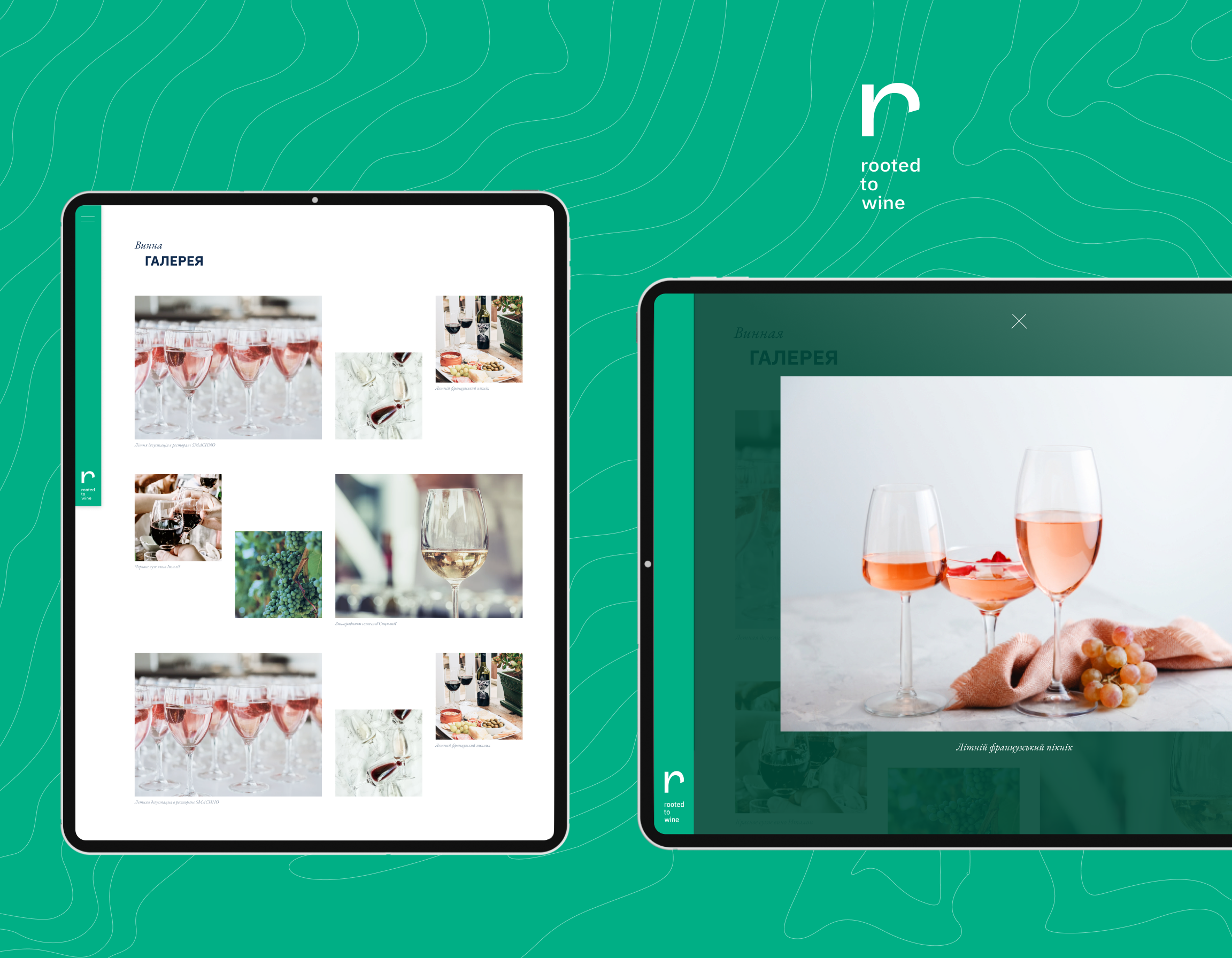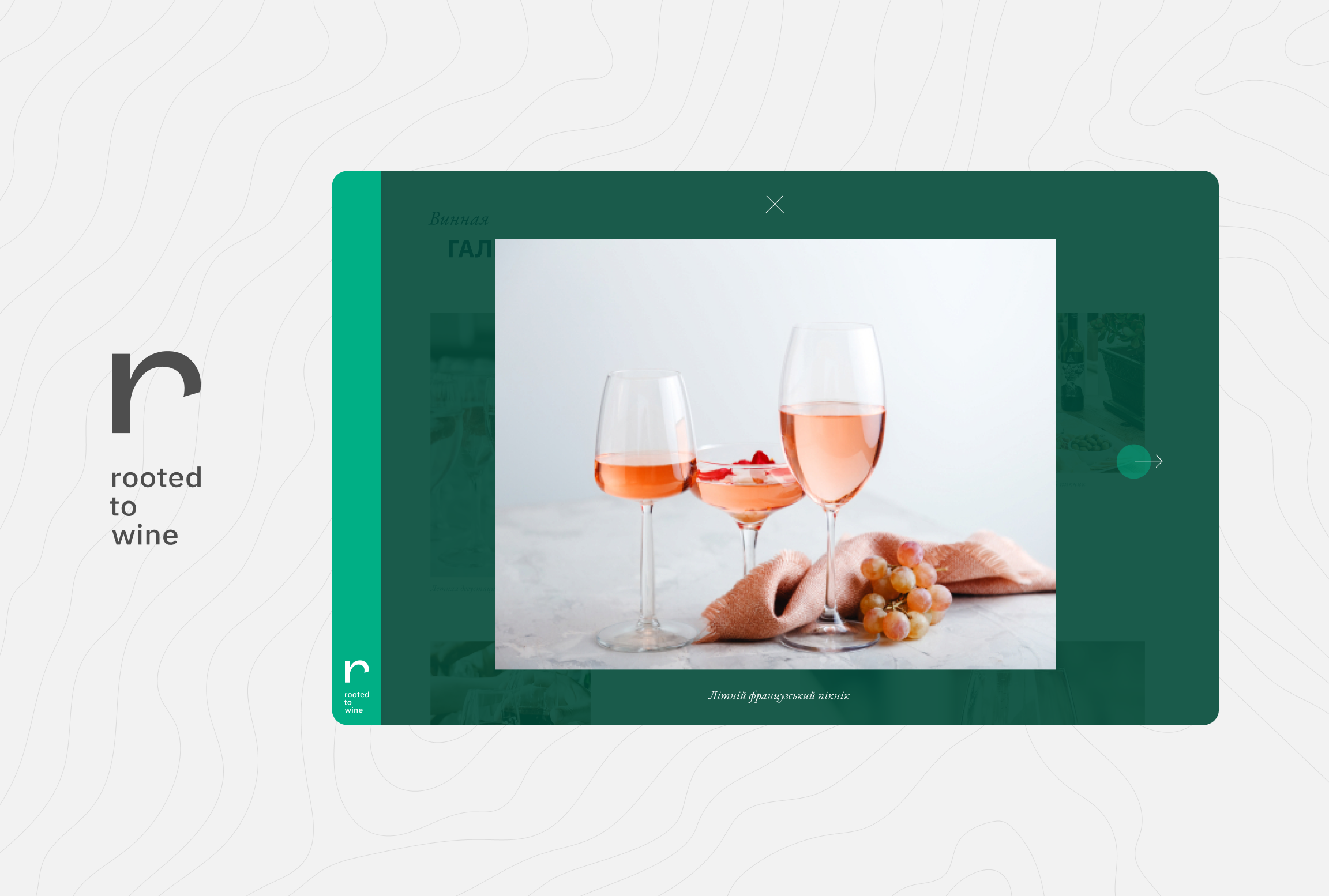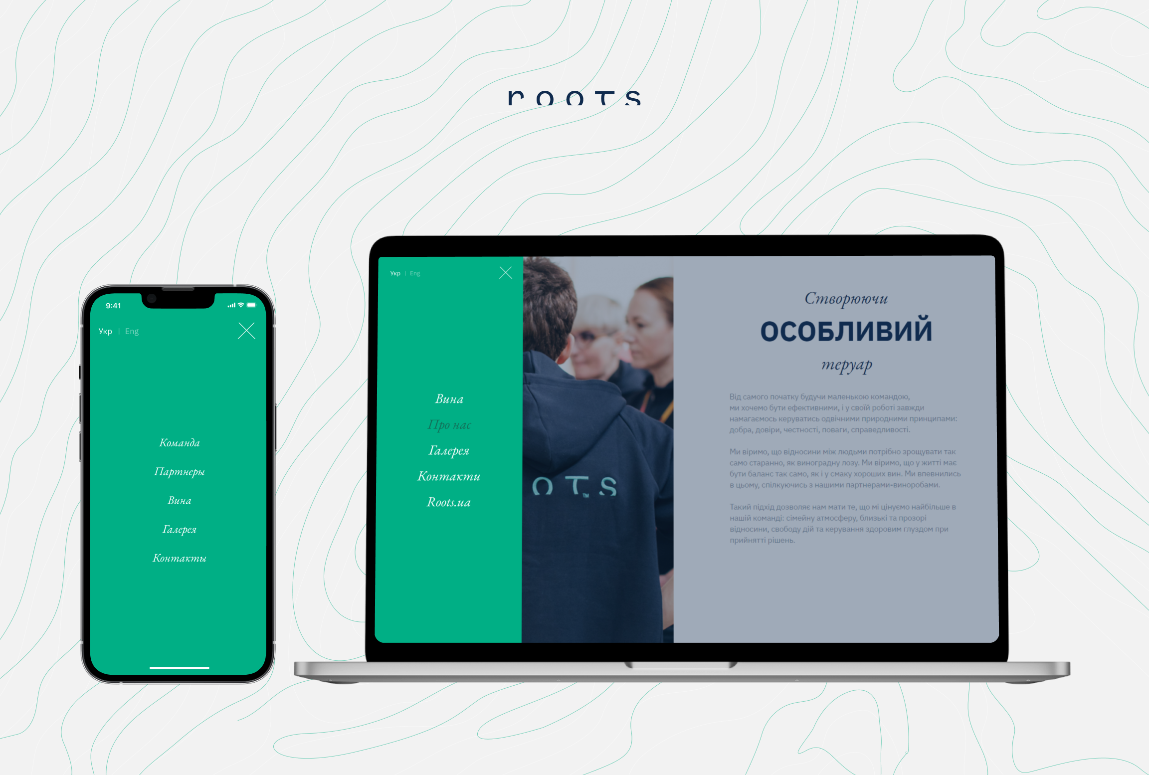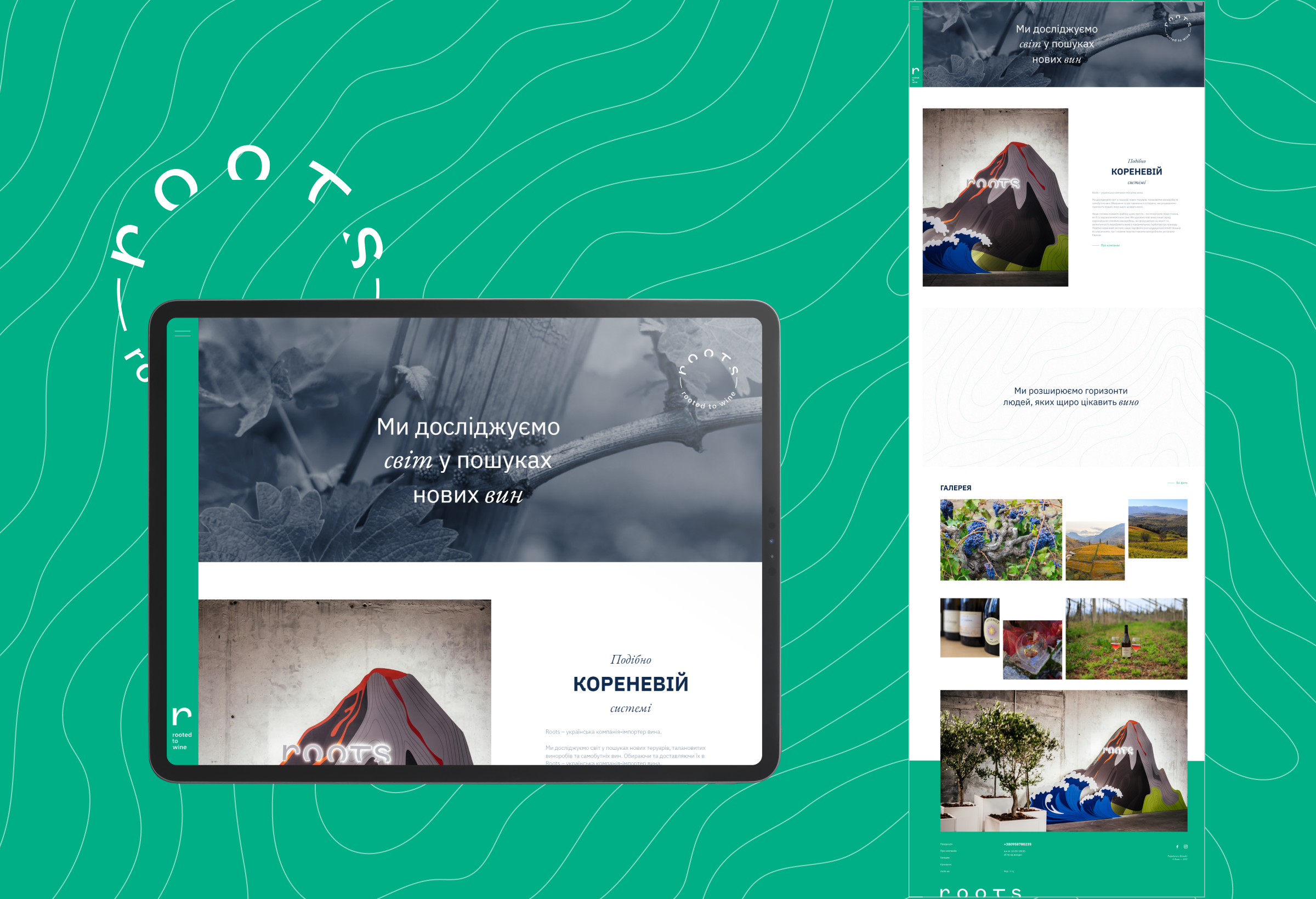 У нас цей пункт завжди на першому місці. Ми провели UX-аналіз, вивчили конкурентів Roots. Вирішили виконати малювання сайту у фірмовому стилі компанії, тому використовували кольори стиглого винограду: світло-зелений, синювато-чорний та білий. Додали брендову графіку та фірмовий стиль компанії.