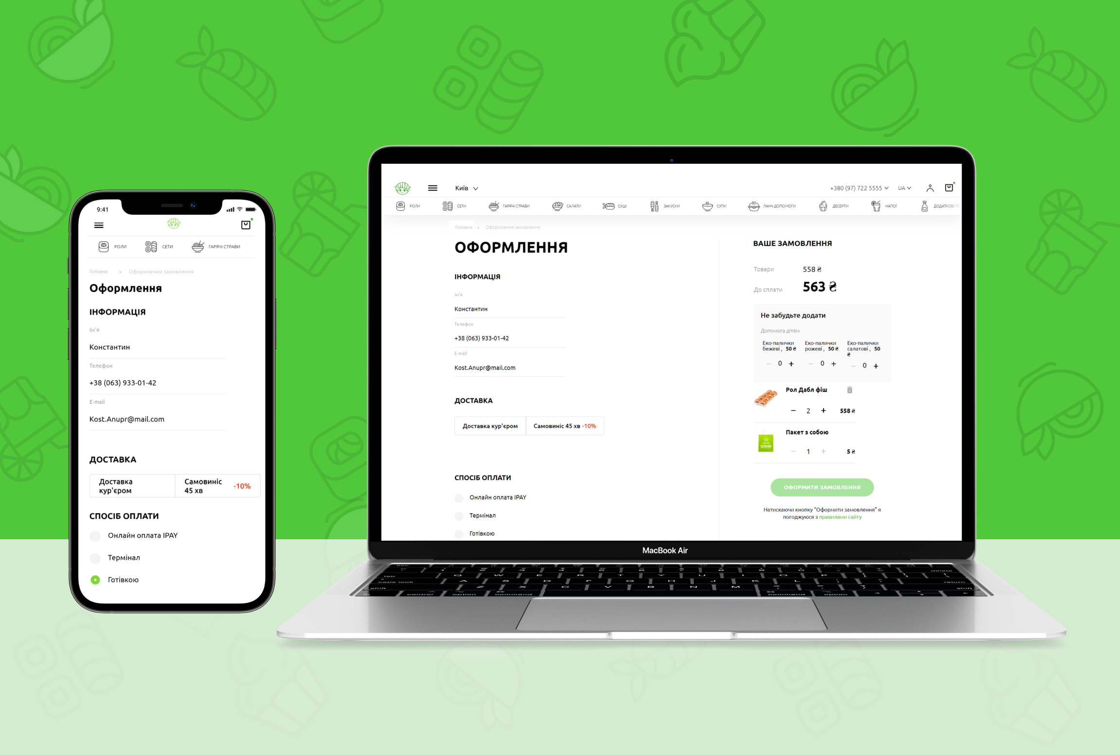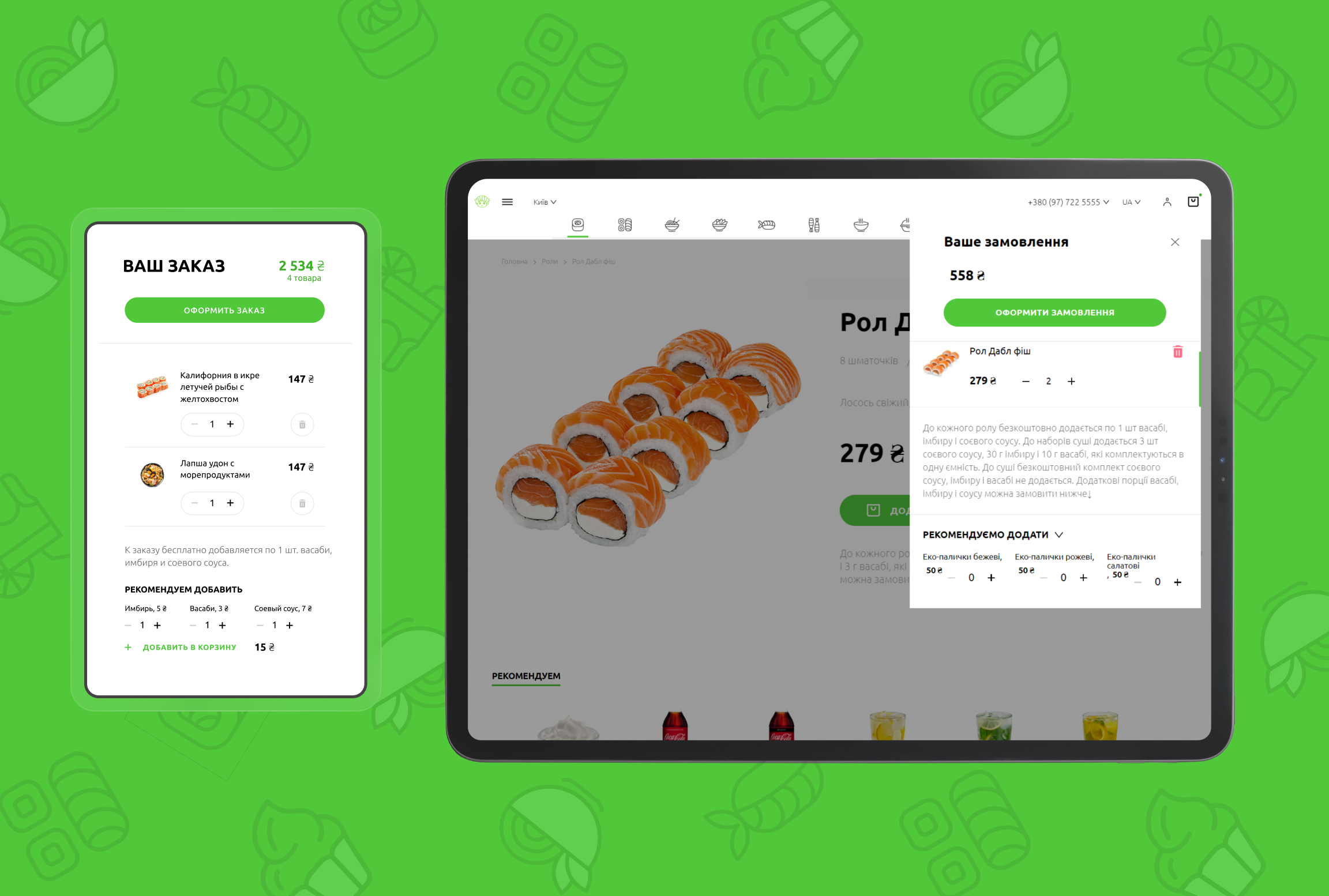Вже на стадії оформлення покупки в кошику відвідувач віртуального ресторану може визначитися, чи хоче він подвійний васабі або більше імбиру. Завдяки POS-системі “Сушія” бачить ваше замовлення в режимі реального часу, а його обробка займає менш ніж п'ять хвилин. Якщо ви із запізненням раптово згадаєте, що потрібно більше соусу, то замовлення можна відредагувати. Менеджер зв'яжеться з вами та уточнить деталі.
