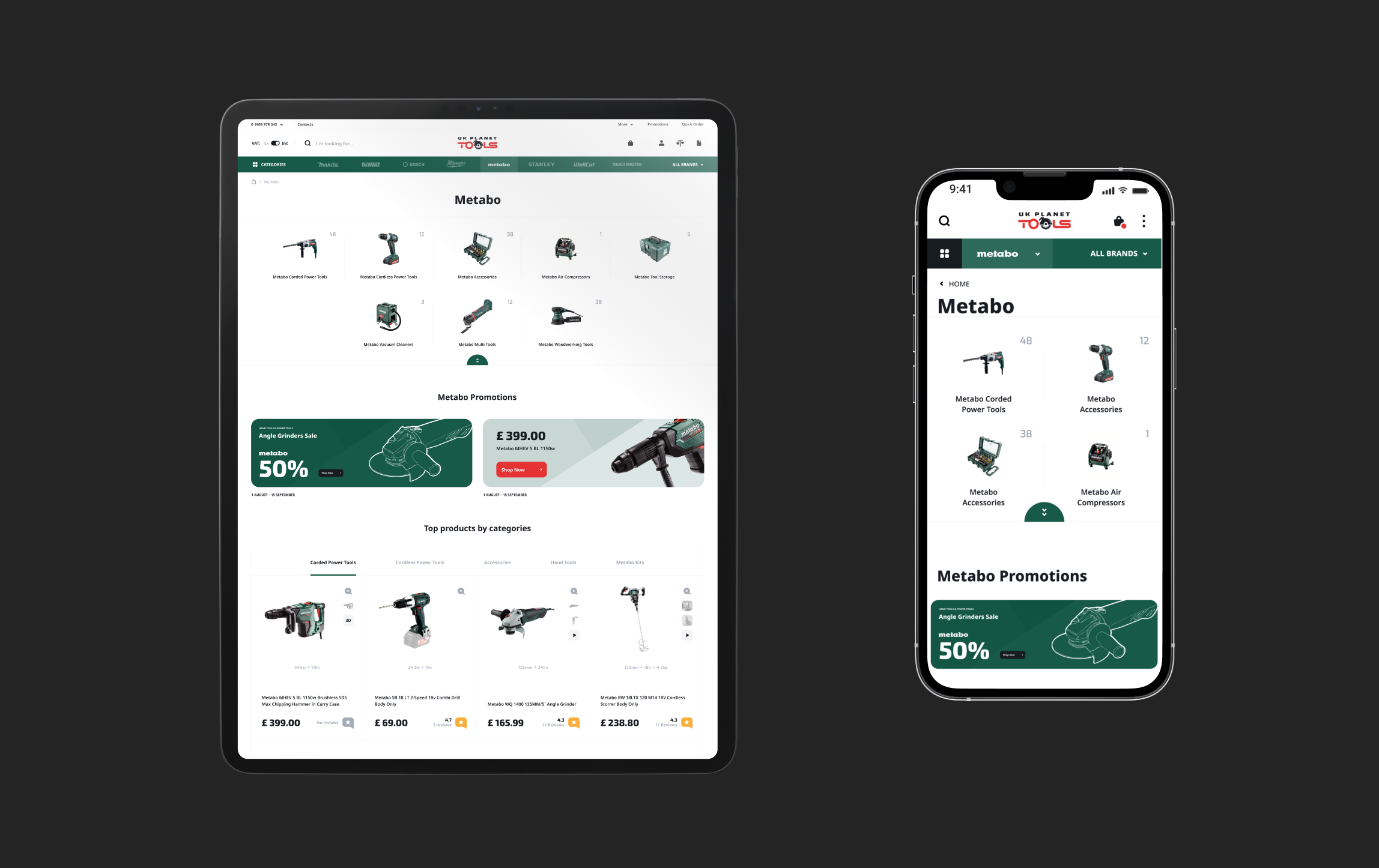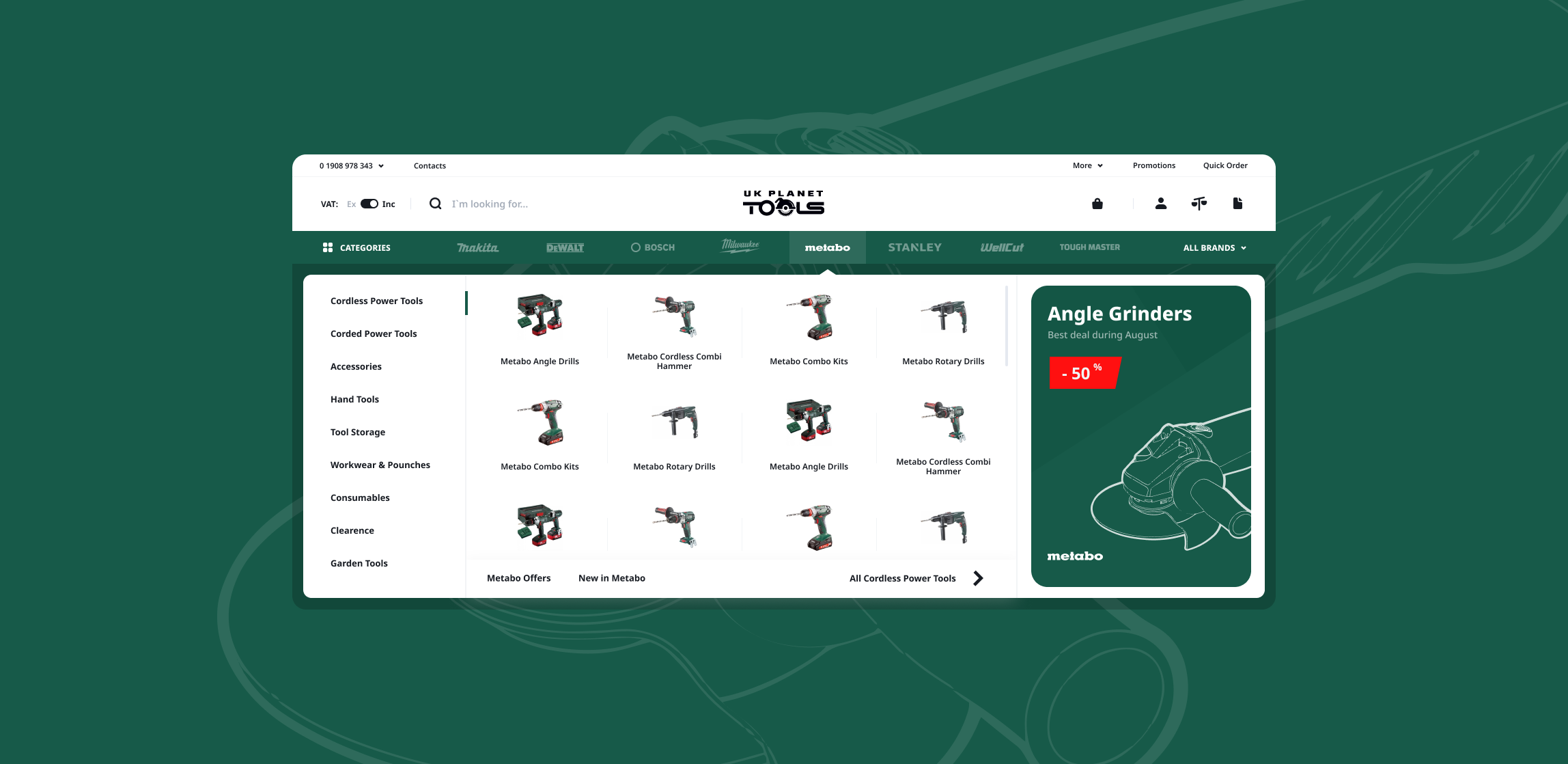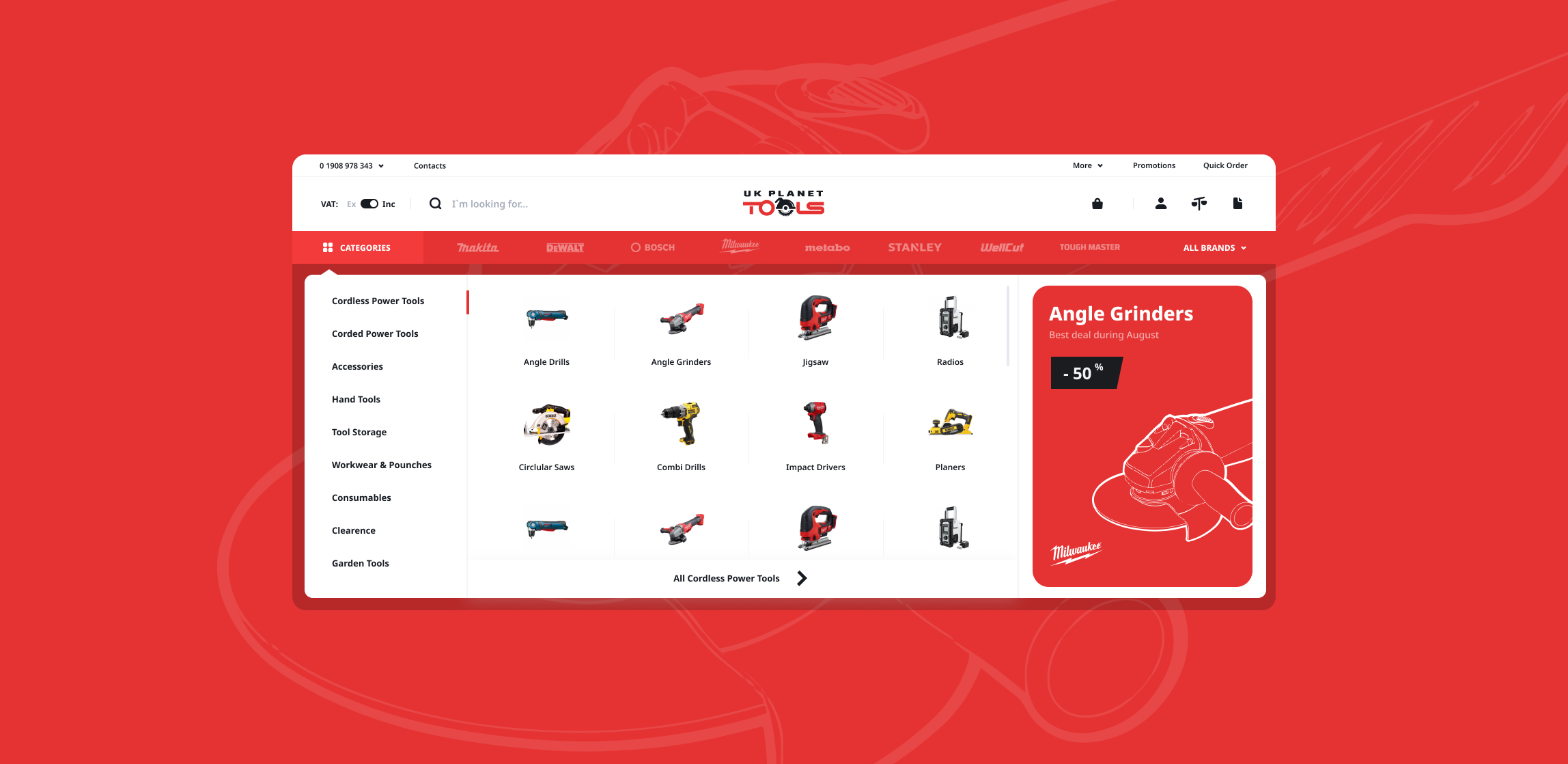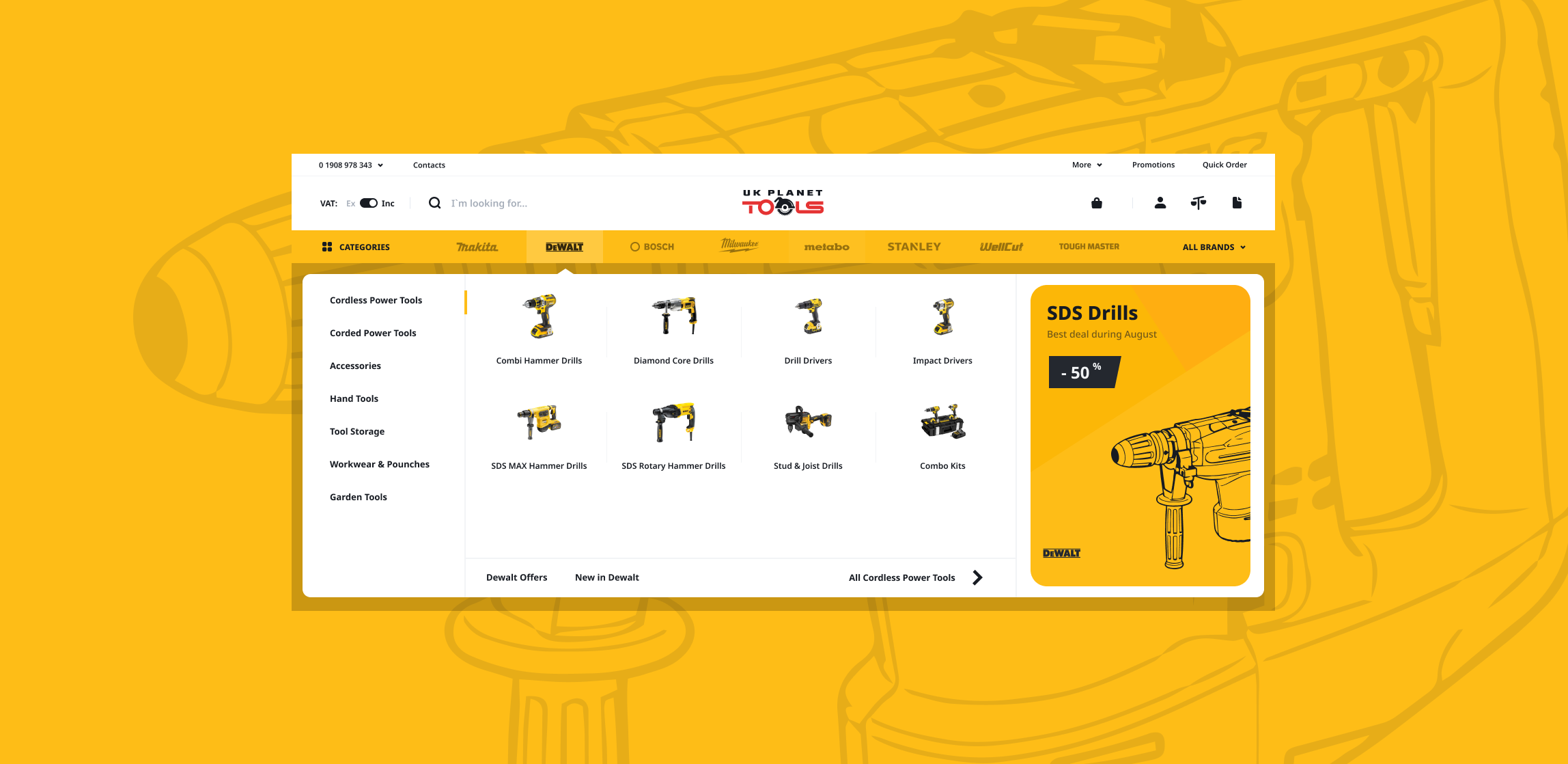 Ми придумали унікальний функціонал, заодно підвищивши впізнаваність компанії UK Planet Tools. Клац на будь-який із представлених брендів на головній сторінці змінює колір сайту. Натисніть на Makita, і буде синій колір, а якщо на De Walt, то буде жовтий. Пошук товарів перетворюється на міні-гру, яка закінчується покупкою.